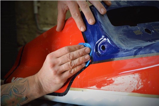 Step 4: The varnish has been sanded with P500 sandpaper. This will ensure perfect adhesion for all the masking and colour areas we are going to do. Next, we can apply the adhesive lines and mask the areas to be protected.
