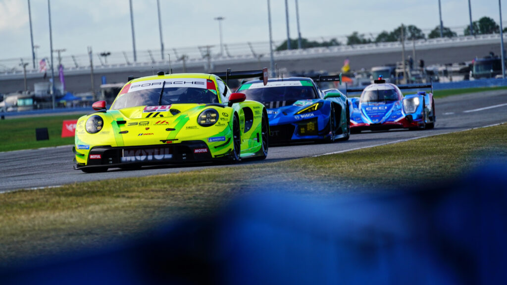 Thomas Preining is leading GTD Pro in the #911 Manthey Porsche GT3, the team’s first IMSA race. They’re locked in a battle with the #1 Paul Miller BMW of Dan Harper, with the highly-rated Austrian going hammer and tongs to defeat Harper, another highly-rated driver, this time hailing cfrom Northern Ireland, with the two separated by less than a second.